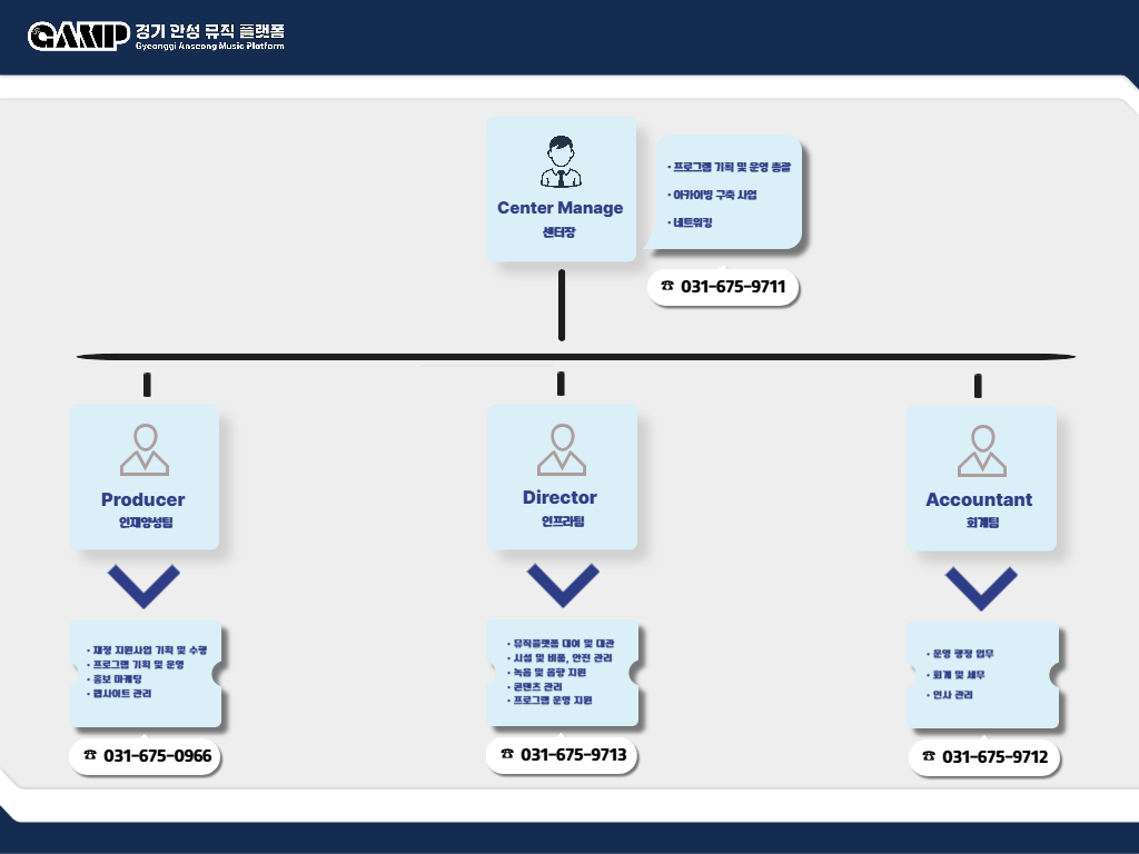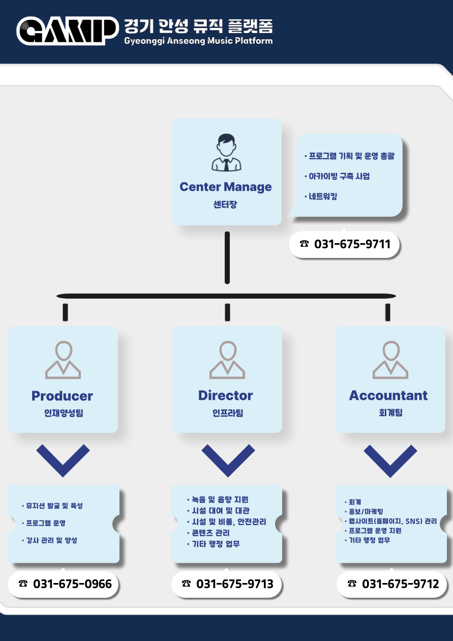 | 전화번호 | 교육 프로그램 문의 : 031-675-0966 대관·대여/레코딩 문의 : 031-675-9713 회계·행정·인사 문의 : 031-675-9712 | 팩스 | 031-674-9714 |